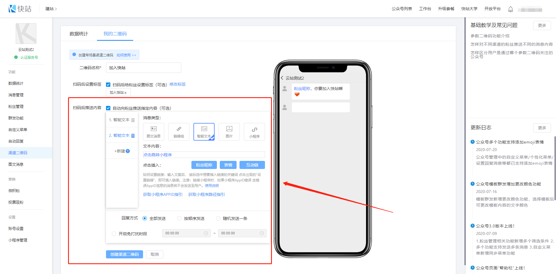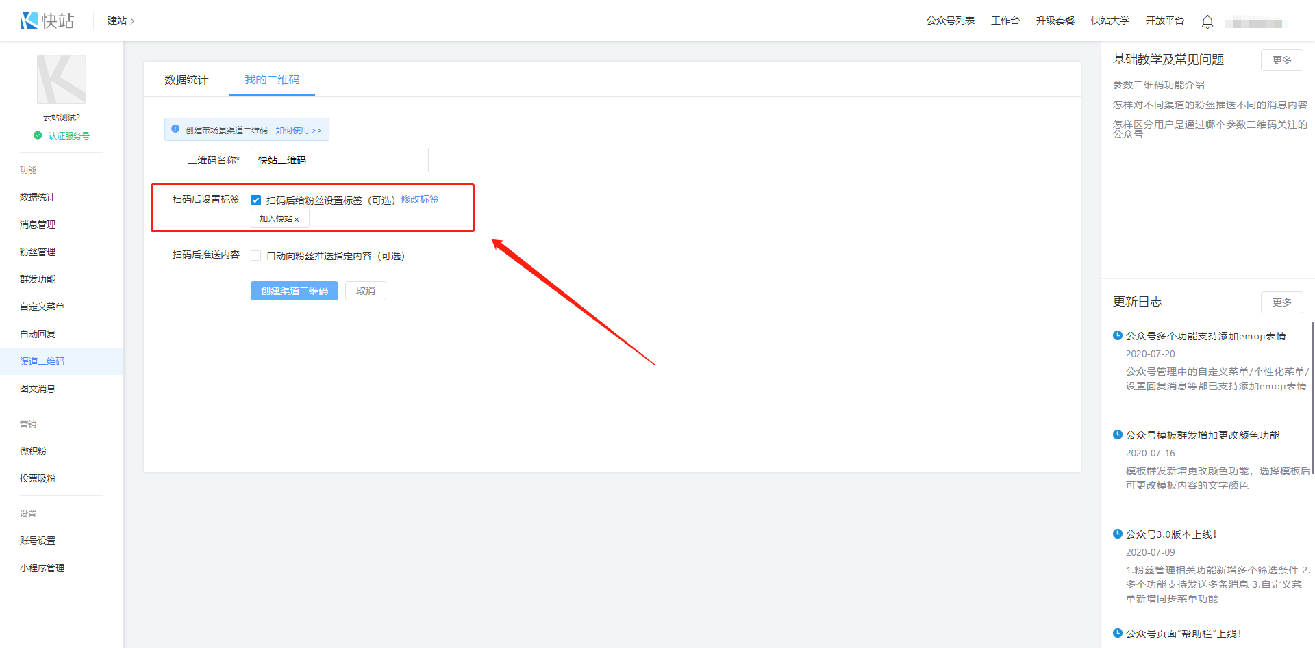 开启后您会进入渠道二维码的创建页面,页面中的两种扫码效果默认都会为您勾选,其中第一种效果不可手动取消,未关注者扫码后一定会进入引导关注页;关注后给对方推送什么内容可以由您自主选择。若您只是用于进行扫码关注的渠道统计,可以取消勾选第二项动作。