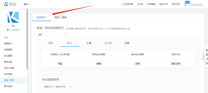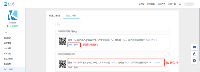 也可以在“我的二维码”中查看具体的扫码数据情况,针对每个二维码,我们会为您统计它的“扫码进入公众号人数”、“新用户数量”、“老用户数量”以及“新粉丝转化率”等。您可以随时编辑与删除该参数二维码。